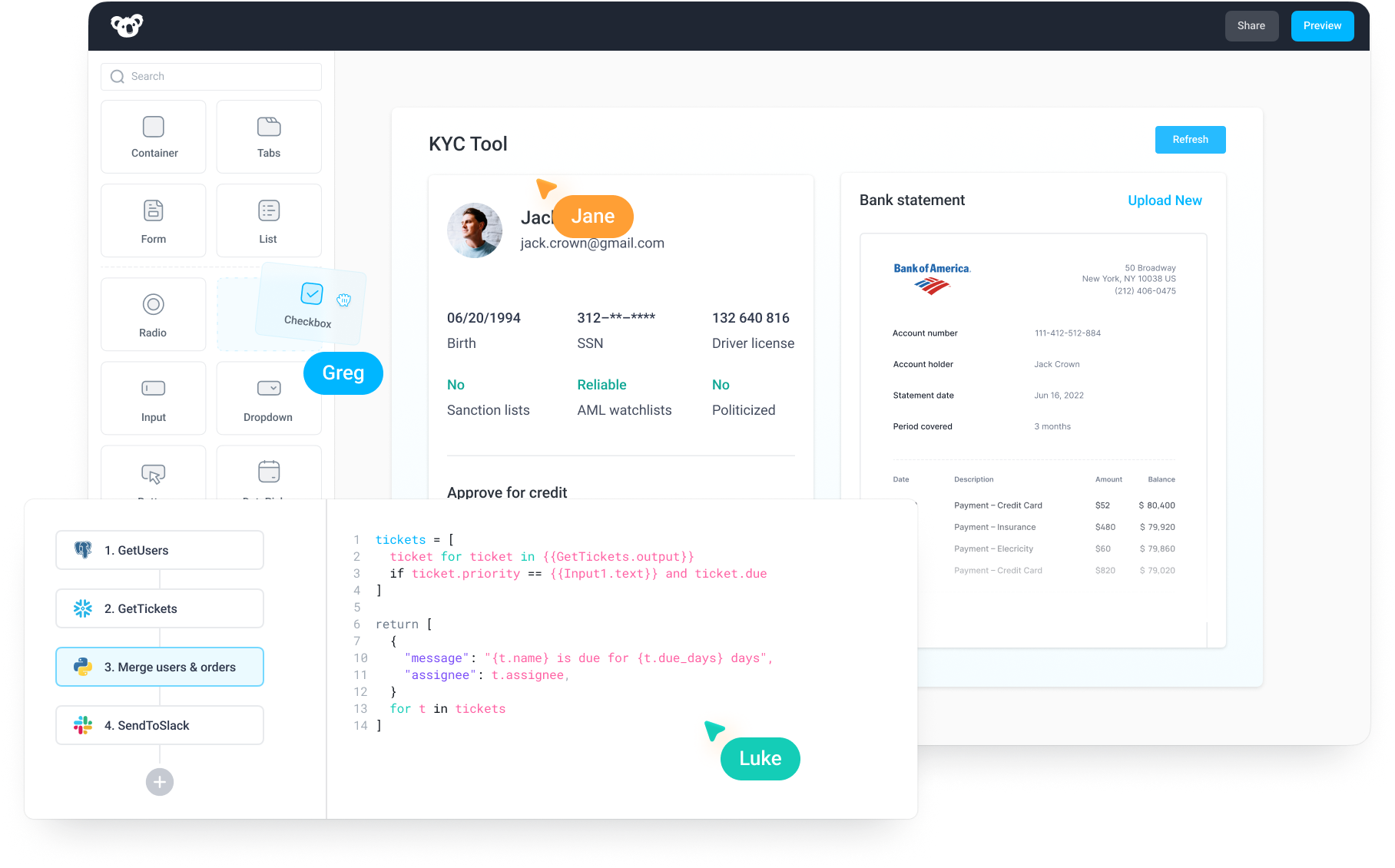 Quickly build apps, workflows & jobs connected to your data. Secure with Granular Permissions (RBAC), SSO, Audit Logs and Secrets Management in seconds. Deploy with Git and monitor production. Extend anything with code
