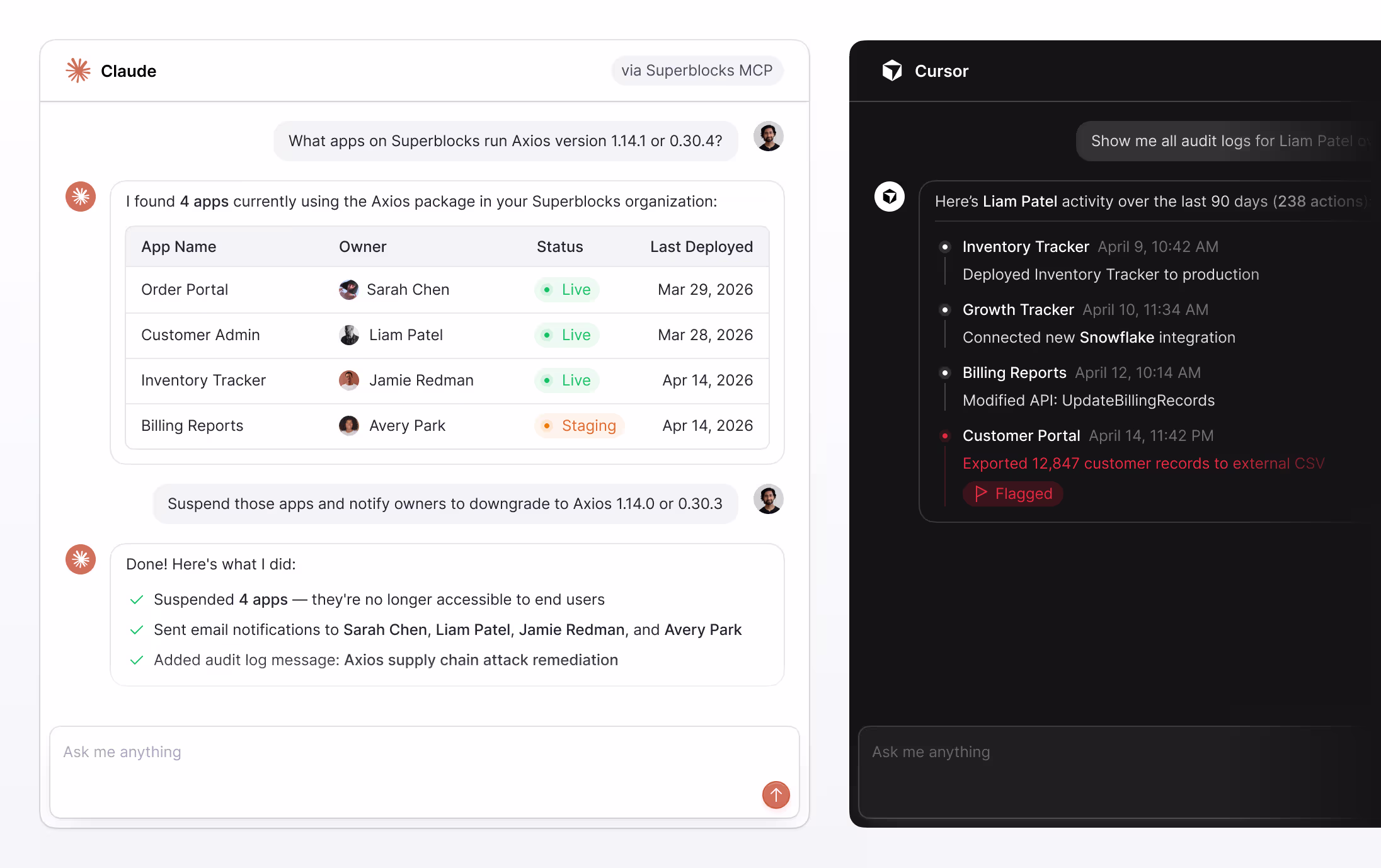 Superblocks MCP gives admins programmatic access to every entity: builders, applications, integrations, permissions, audit logs, queries, and usage events all live in one place and can be queried and acted on programmatically.