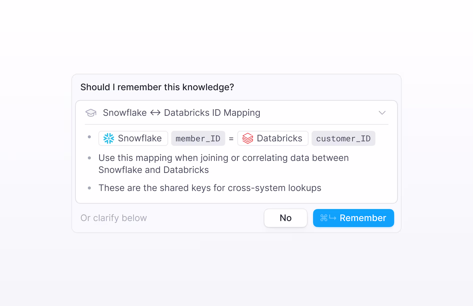 Over time, this creates a shared knowledge layer across your organization. Clark gets smarter with every use, reducing repetition and improving accuracy for every builder in your organization. Memory is managed automatically, ensuring the context graph stays relevant as your systems and data rapidly evolve with your business.