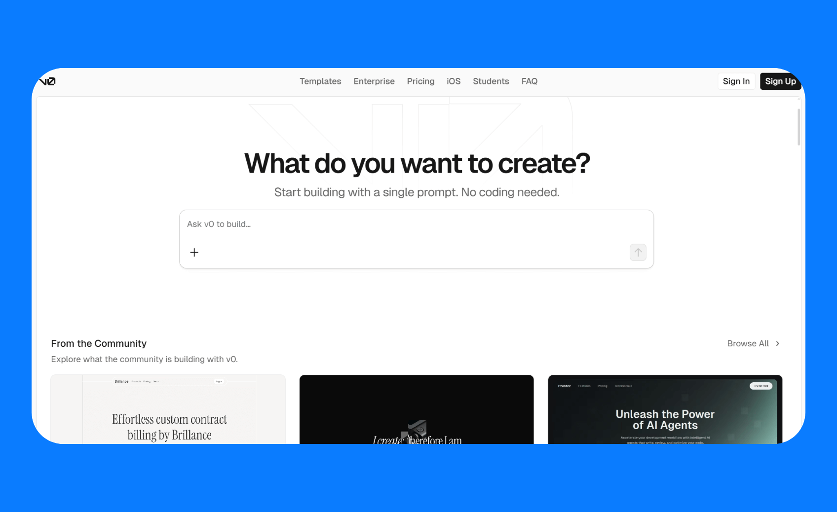 - Agentic capabilities: v0 can reason, plan, inspect code/sites, and fix errors automatically.