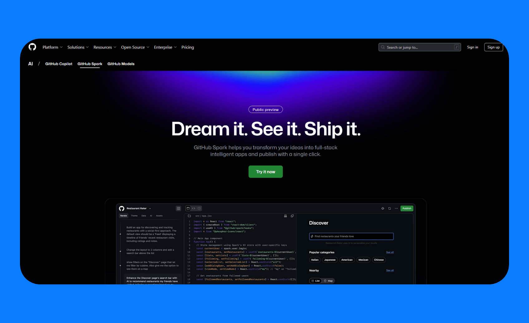 What it does: GitHub Spark is an AI-powered, app-centric platform from GitHub for building, previewing, and deploying full-stack apps directly from natural language prompts.