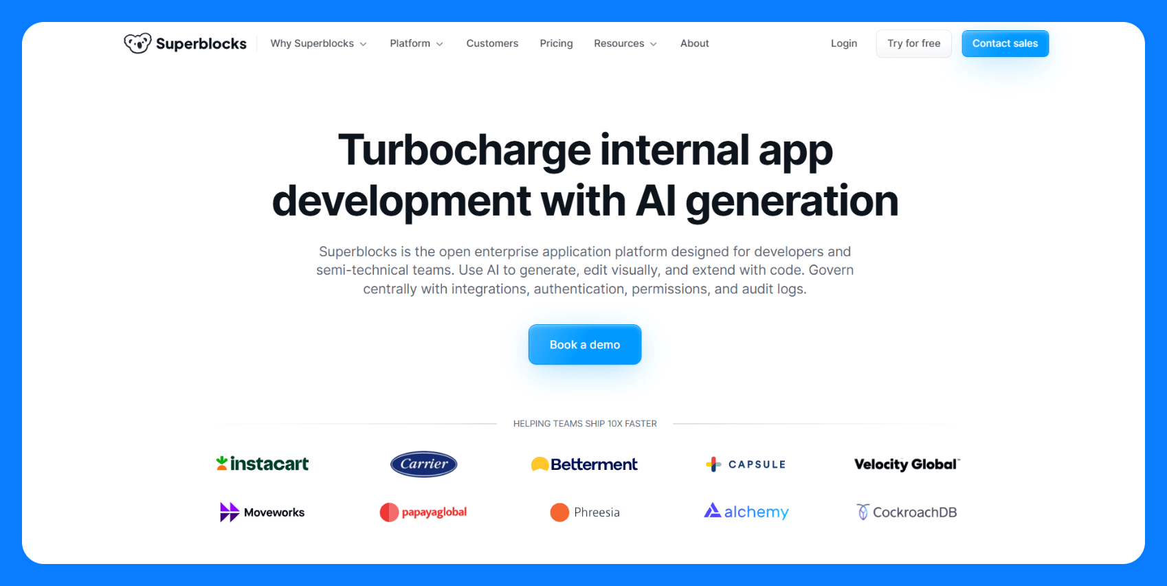 Superblocks is an AI-native enterprise app development platform that helps teams build and manage internal tools with complete control, security, and speed. It combines natural language AI (Clark), a visual editor, and a React-based code mode, giving teams the flexibility to move between modes based on skill level or project complexity.