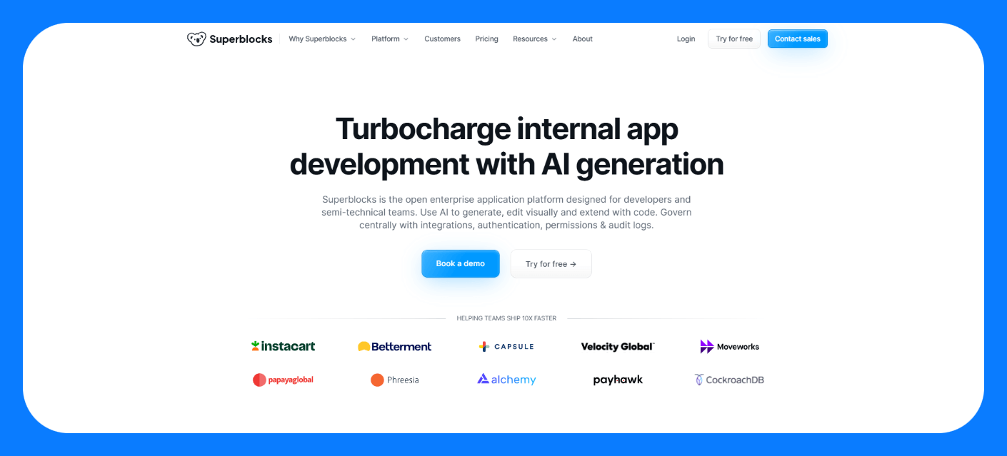 - Superblocks: A fully extensible, AI-powered enterprise app platform that blends low-code simplicity with full-code flexibility. Developers can generate apps with AI, edit visually, and extend with React, Python, and SQL without vendor lock-in or deployment restrictions.
