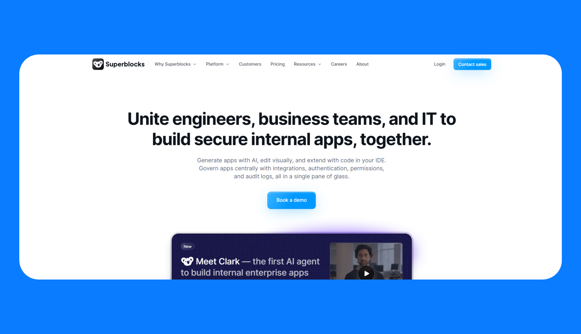 - Flexible development modalities: Teams can use Clark to generate apps from prompts, the WYSIWYG drag-and-drop editor, or code. Superblocks syncs the changes you make in code and the visual editor.
