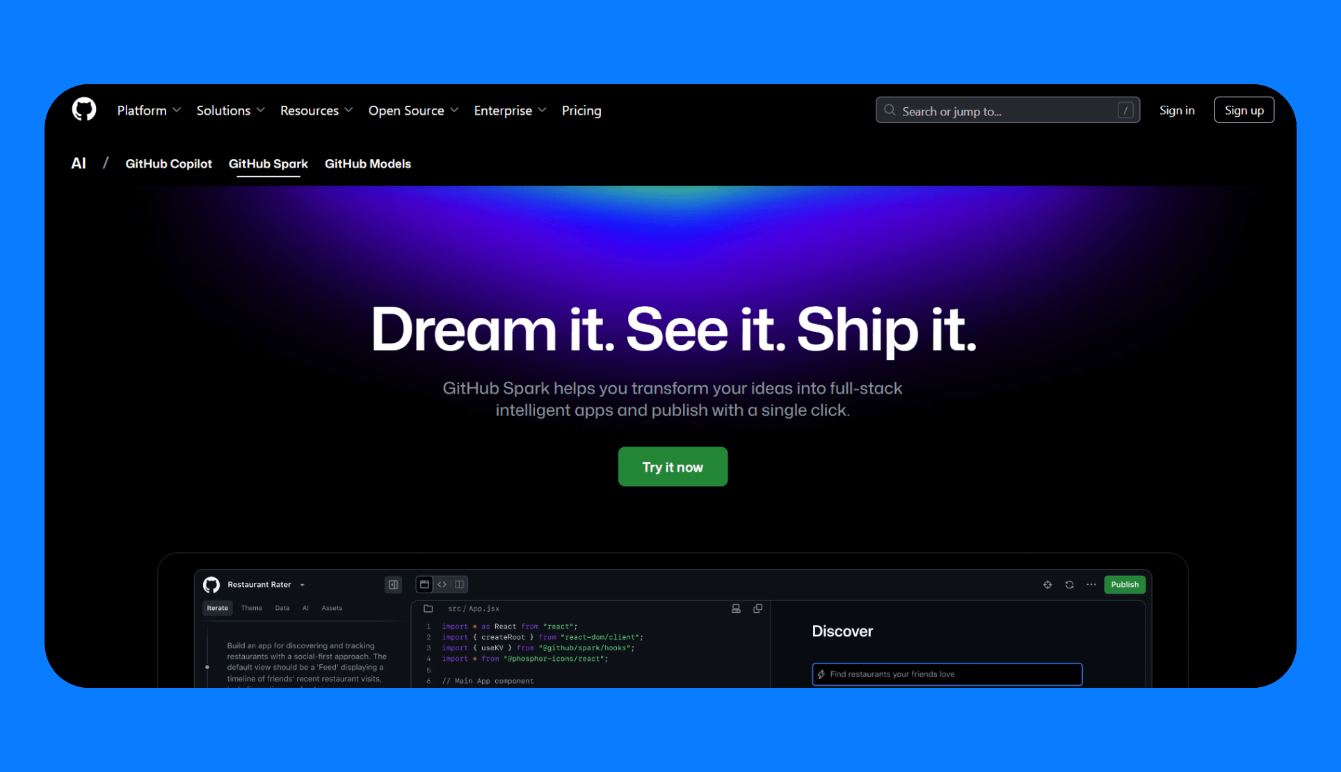 - Iterative prompting and editing: Spark lets you add features or make changes by prompting again or editing code manually in Codespaces.