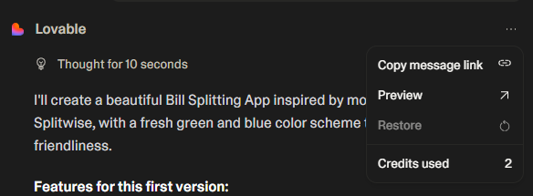 To test how many credits different tasks consumed, I used Lovable on the free plan to build a simple bill-splitting app. I could see the cost of each message in the message history by hovering over the three dots of a message. The 5 daily credits on the free plan disappear quickly. Expect to hit the limit after 3 meaningful interactions.