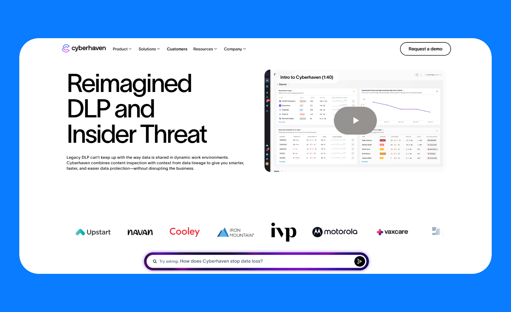 What it does: Cyberhaven provides data protection and insider risk detection by mapping how sensitive data moves across users, applications, and devices.