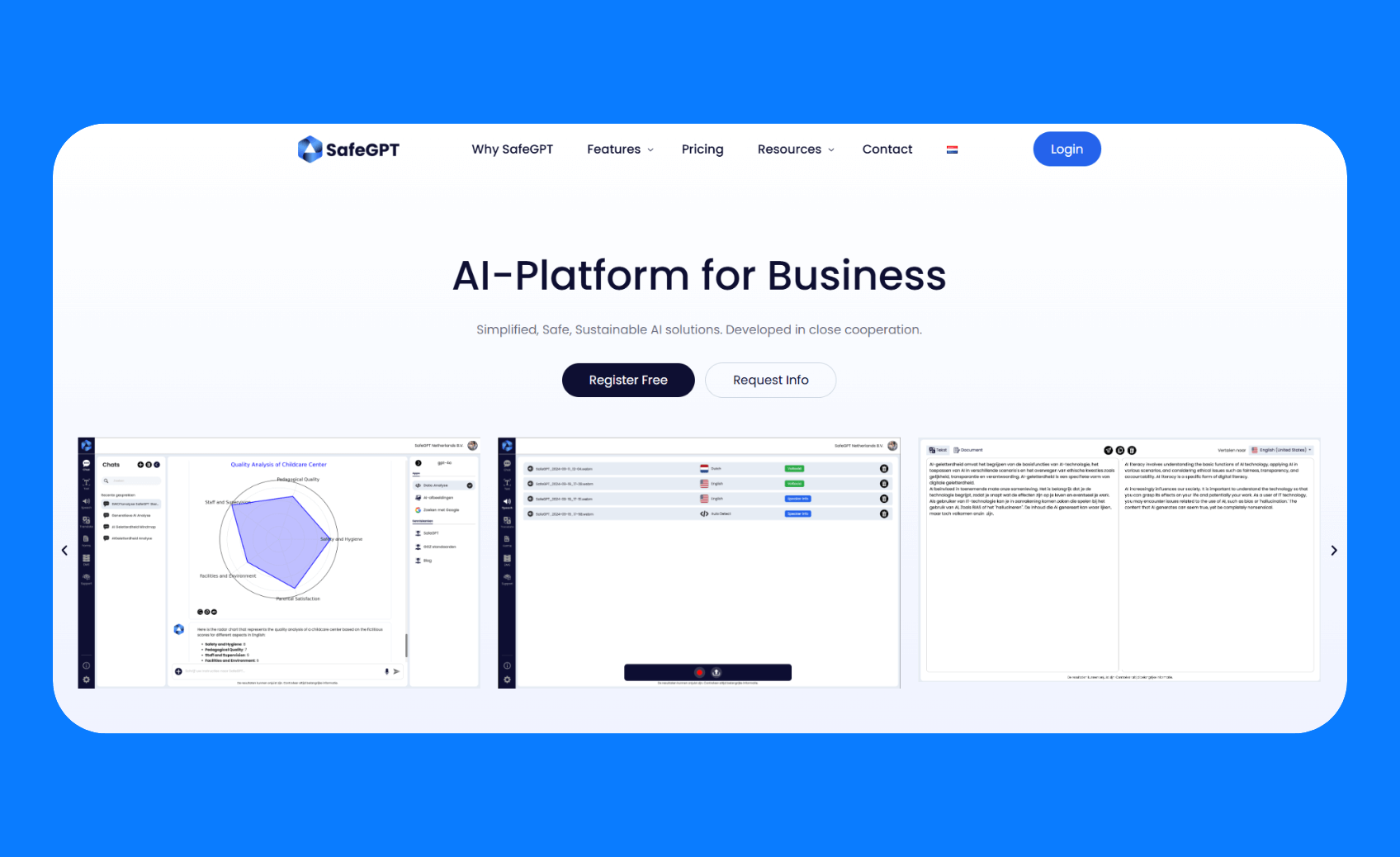 - Data sovereignty and no training on user input: SafeGPT keeps all data processing within Europe and does not use prompts or responses to train its models.
